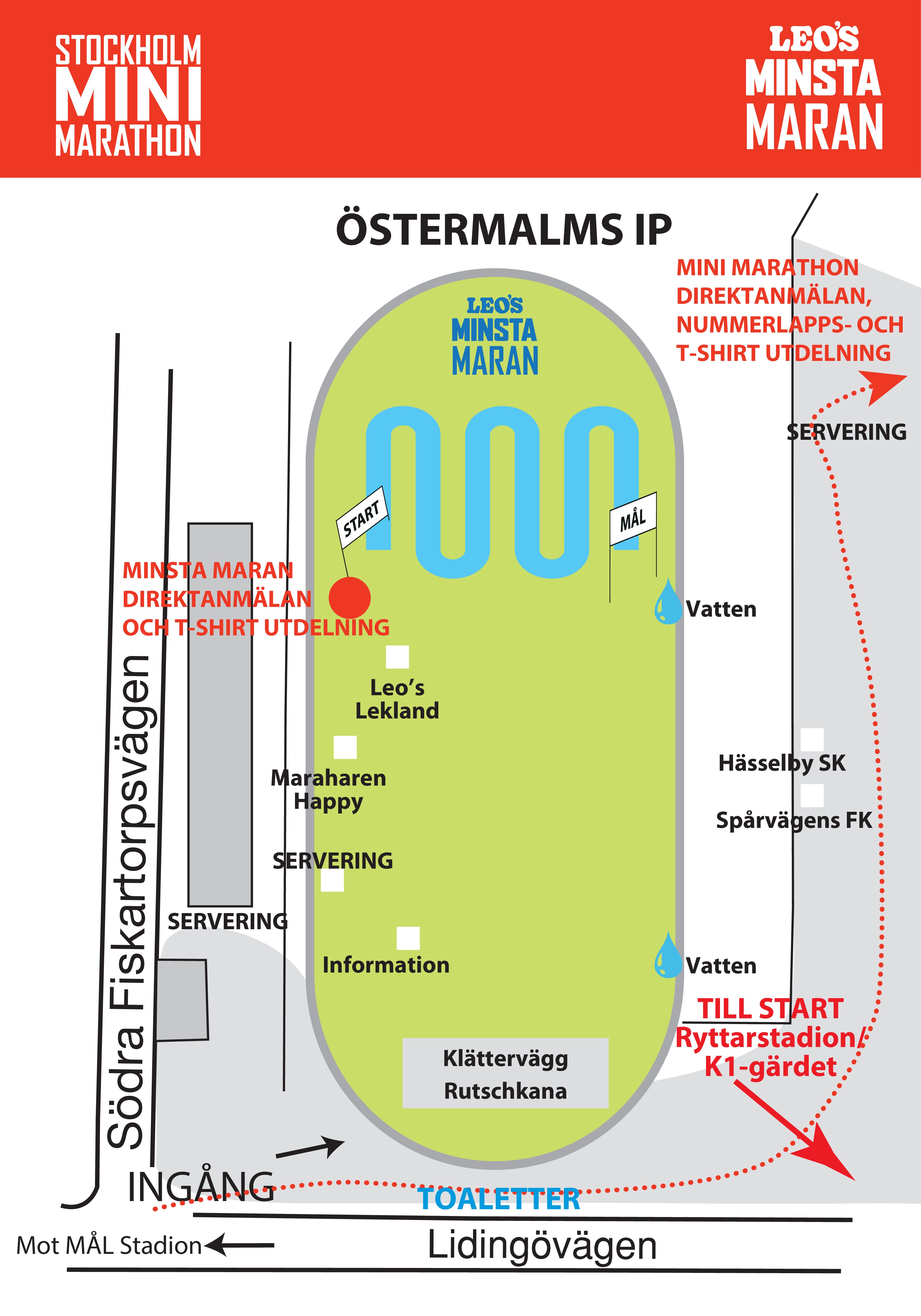 Det viktiga är inte att komma först eller att få en bra tid utan att ha kul. Kuta fort, ta det lite lugnare eller jogga runt med kompisarna. Att springa Minimaran och gå i mål på Stockholms Stadion, att delta på den härliga dagen på aktivitetsfältet är en riktigt kul upplevelse både för barn och föräldrar. På Östermalms IP kommer ni bland annat kunna testa på några olika friidrottsgrenar med föreningarna Hässelby SK och Spårvägen FK. Det finns även matförsäljning både på Stadion och aktivitetsfältet på Östermalms IP. Starterna för Minimaran kommer att gå på gräsgärdet vid Ryttarstadion K1 Gärdet eftersom vi även i år behöver mer plats.